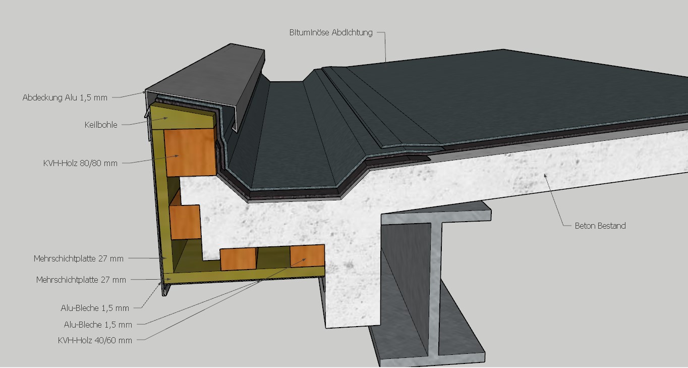 - Neuaufbauten: Planung und Visualisierung von Dachabdichtungen für Neubauten, inklusive Materialauswahl und Konstruktionsdetails.